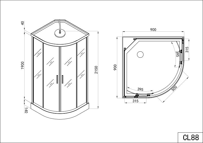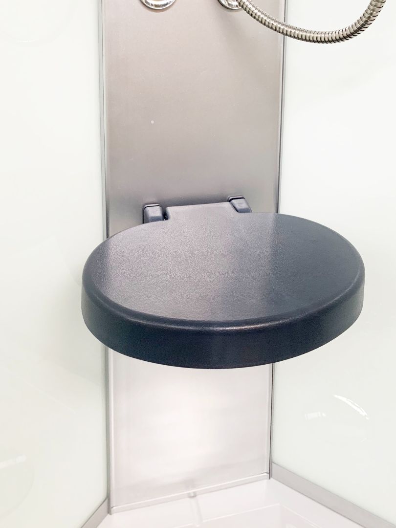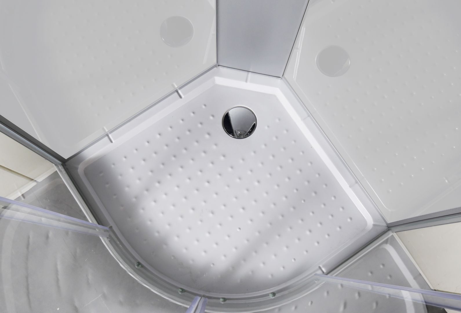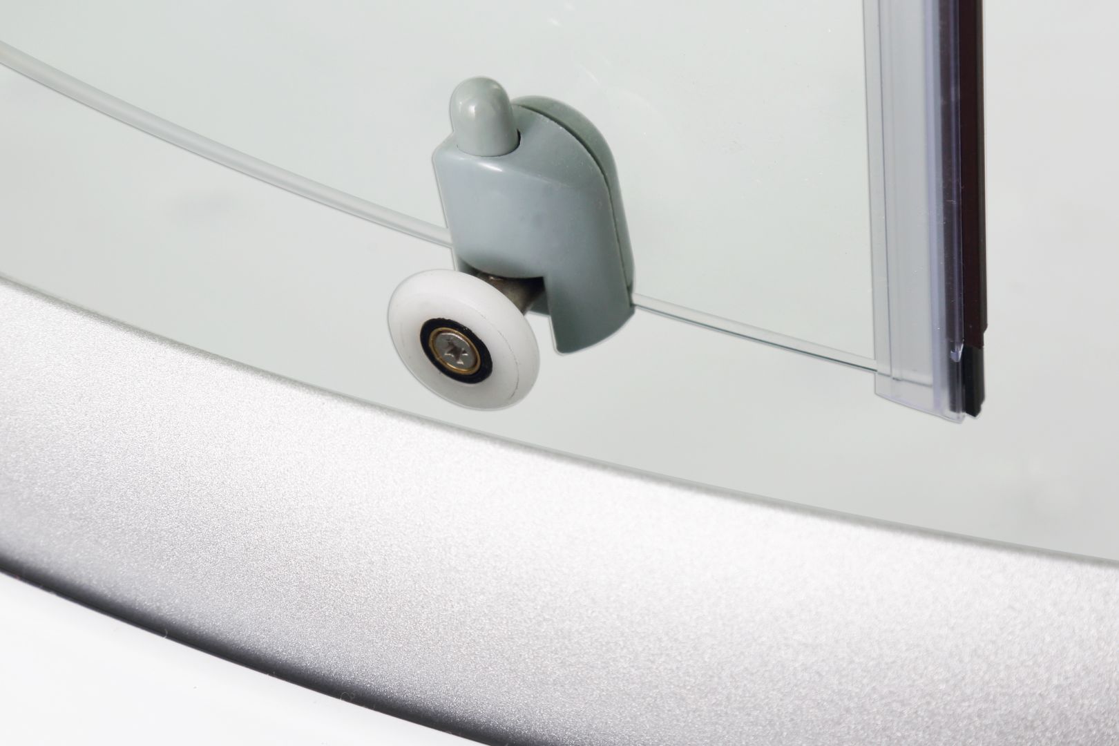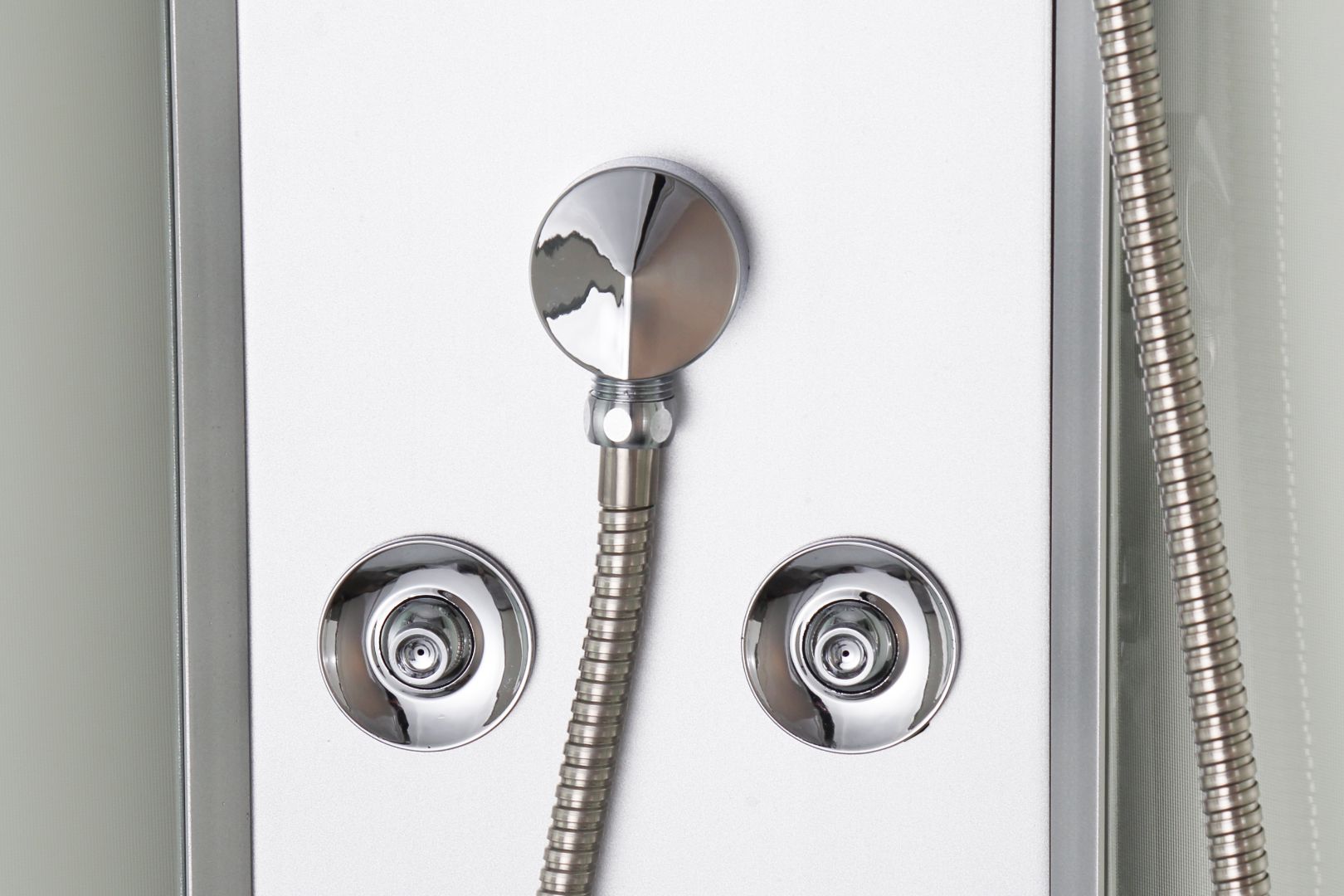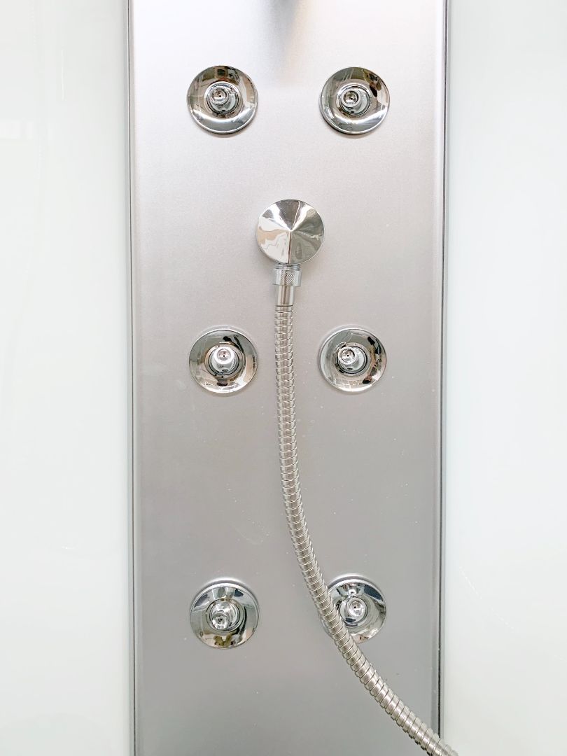 La cabina de ducha Rumba está completamente cerrada. En la esquina hay un panel de ducha con 6 chorros de masaje, una ducha de mano, el grifo mezclador y el botón desviador. Hay un asiento en la parte inferior del tablero. Las demás paredes son de vidrio de seguridad de 5 mm.
