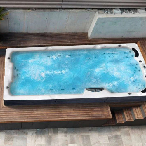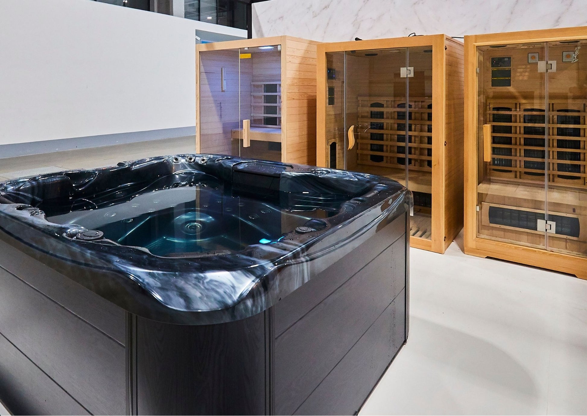 En nuestra sala de exposición podrá ver una selección de nuestros productos, como jacuzzis al aire libre, cabinas de infrarrojos, saunas y sillones de masaje.