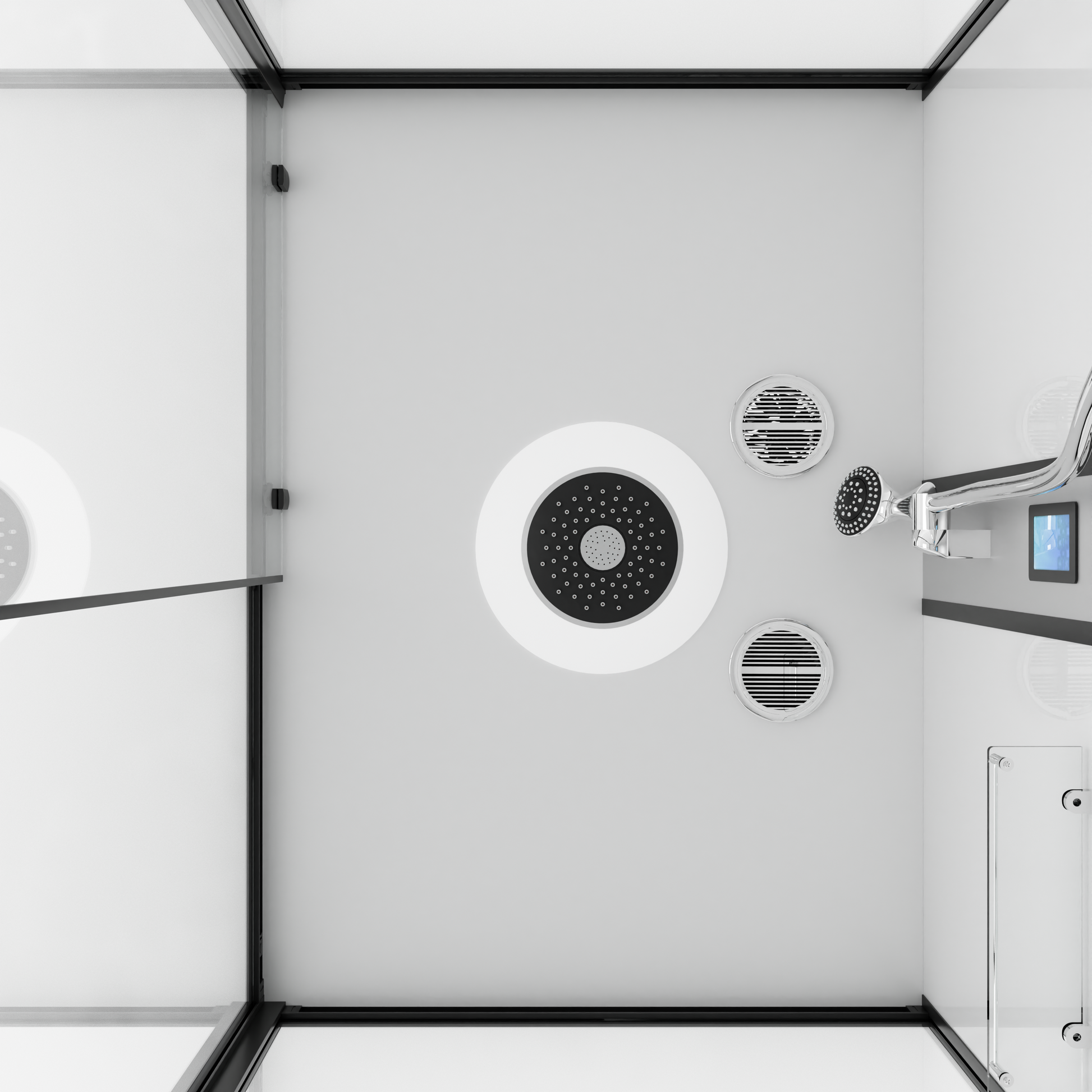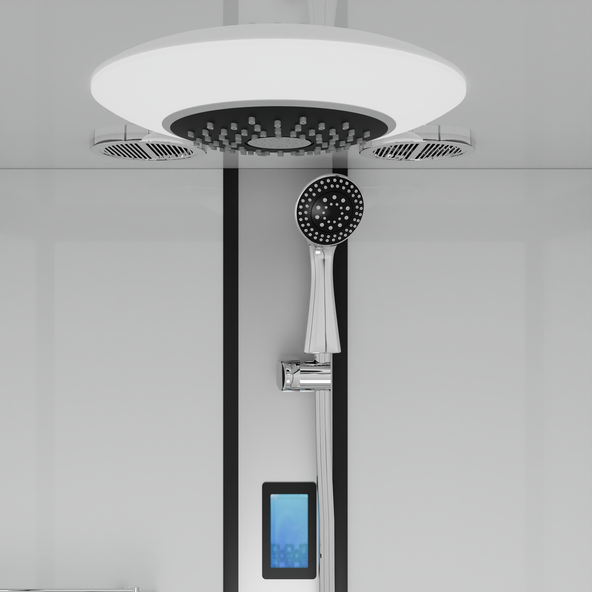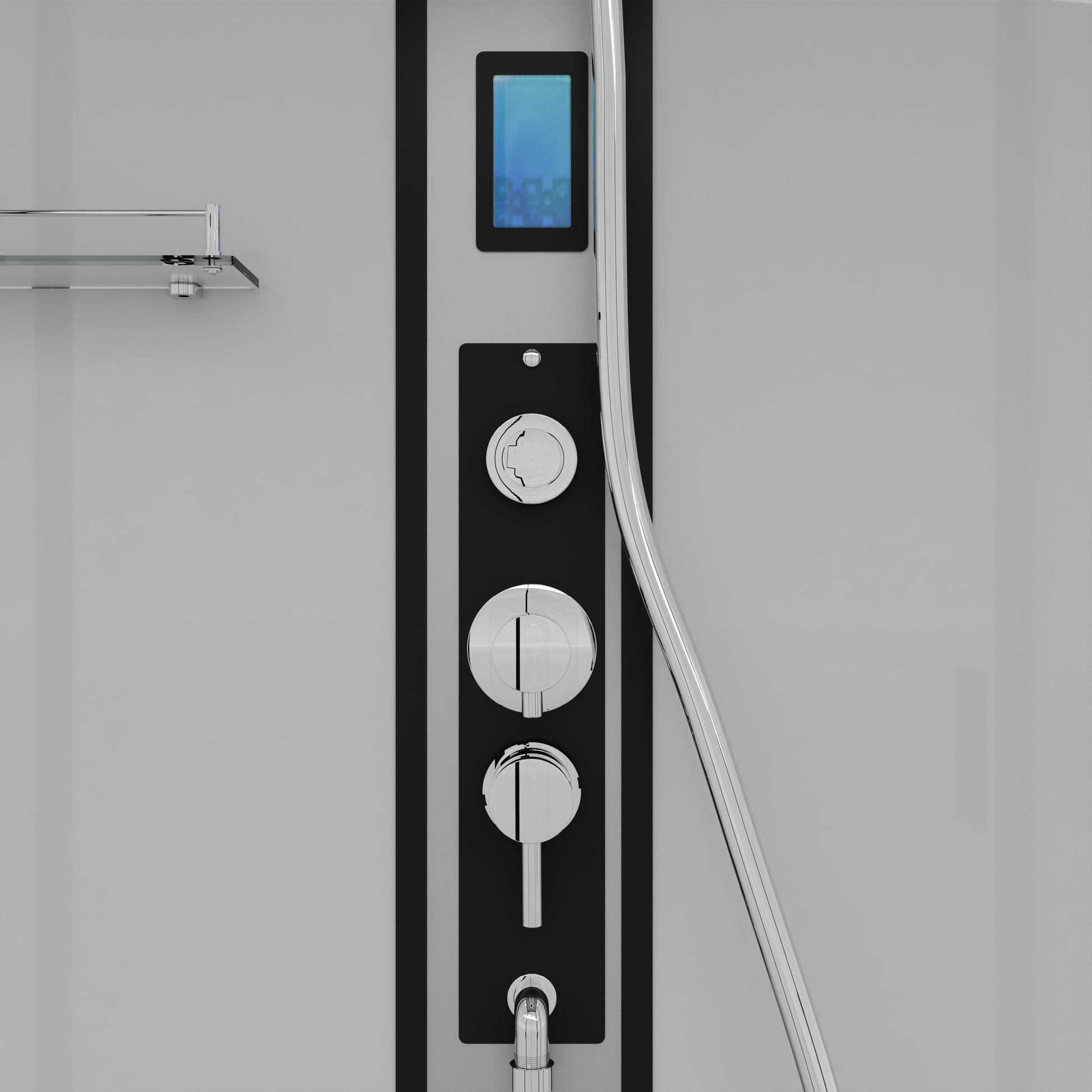 La mampara de ducha Boston Black ofrece características premium que transforman cada ducha en un momento de lujo. Una amplia ducha fija y una teleducha de tres funciones ofrecen diversas opciones de relajación. El panel de aluminio y acero inoxidable con boquilla de masaje a chorro mejora aún más el bienestar. Todas las funciones se controlan mediante una moderna pantalla táctil, que también incluye radio integrada. Un techo de cristal con iluminación LED, ventilador y altavoces complementan las características de alta calidad y ofrecen una experiencia de bienestar integral.