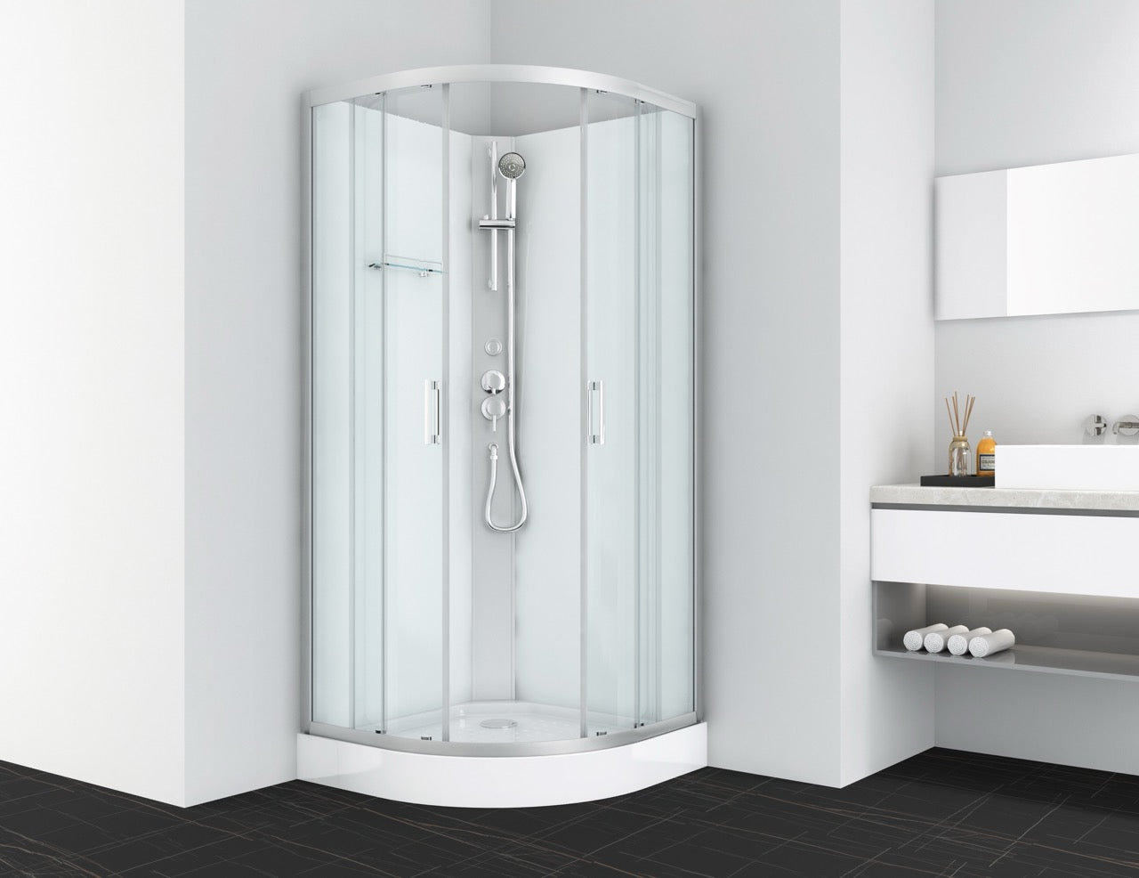 La instalación del Dallas es rápida y sencilla gracias al sistema de montaje rápido Quick Line. El plato de ducha de 14 cm de altura ofrece una comodidad de entrada óptima y el práctico estante de cristal proporciona espacio de almacenamiento adicional para los utensilios de ducha. Esto hace que el Dallas no sólo sea una opción funcional sino también extremadamente fácil de usar.