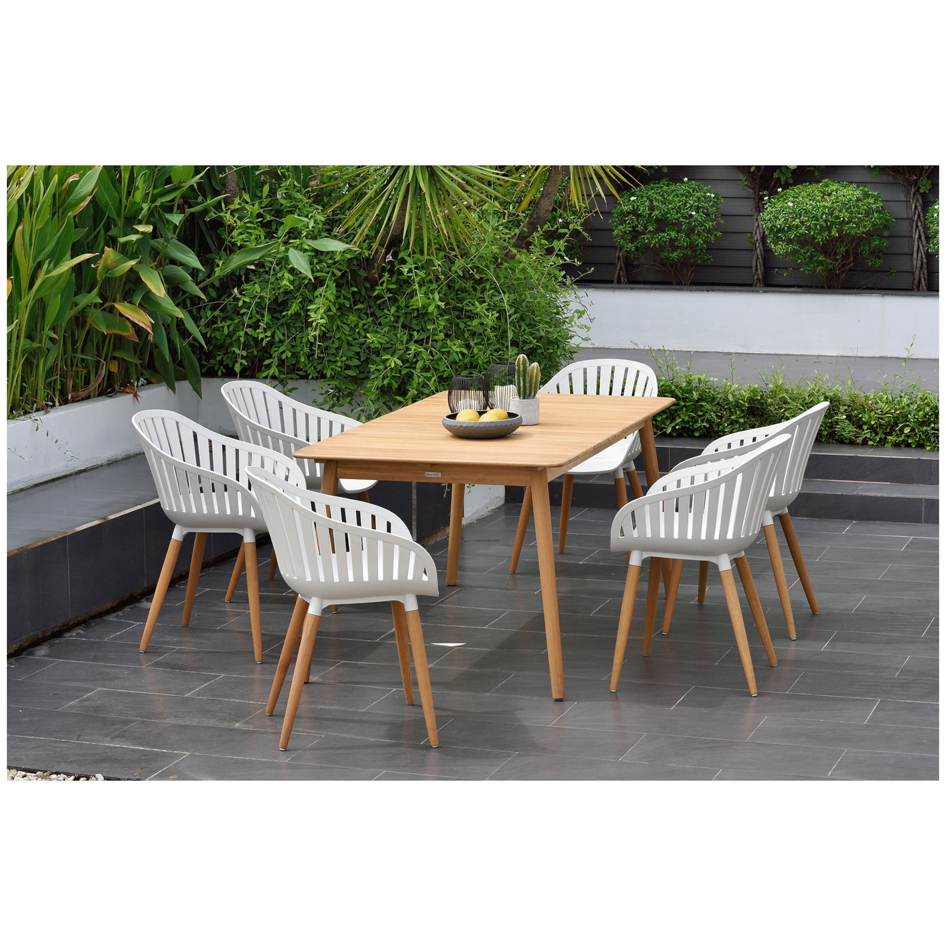 La mesa de jardín Nassau invita a reunirse en un ambiente acogedor. Tome asiento en estos muebles de exterior para almuerzos familiares o fiestas en el jardín con amigos. La madera de eucalipto de alta calidad impresiona por su color cálido y su diseño armonioso completa su apariencia.
