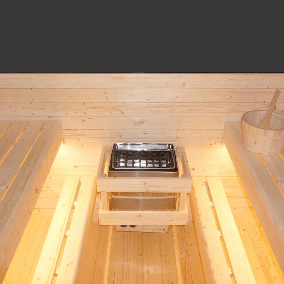 Der Innenraum ist ebenfalls sehr besonders: Die erhöhten Sitzbänke sorgen für einen noch intensiveren Saunagenuss, da die heiße Luft immer nach oben steigt. Zwei Saunalichter beleuchten die Sitzbänke und setzen die Sauna gezielt in Szene ohne zu blenden. Für eine ruhige, entspannte Atmosphäre. Ganz einfach anzuschließen mit einem 230 V-Anschluss.
